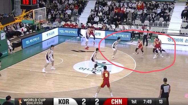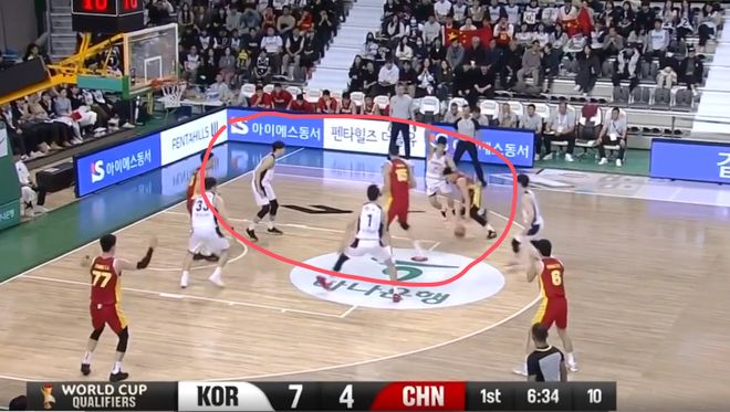 这一球就是程帅澎和曾凡博过度关注弧顶持球的韩国队员,漏掉了油漆区下顺的人