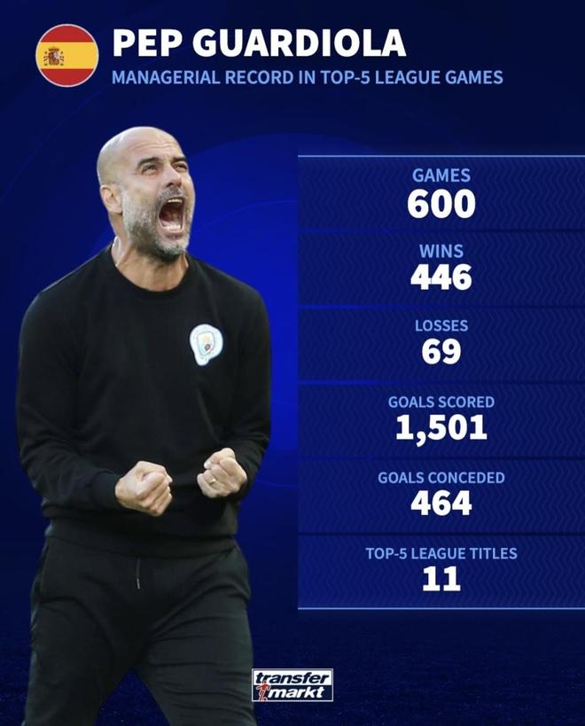 近日,瓜迪奥拉在执教顶级五大联赛比赛中达到了600场里程碑——下面是达成这一里程碑的教练胜率排行榜,展示谁在这些“至少 200 场”高强度联赛中效率最高。